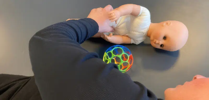 For at opnå et stræk af halsmuskulaturen kan du placere dit barn med favoritsiden hvilende mod din arm og lav en let bevægelse af din underarm, så barnet får hovedet løftet lidt, og der kommer et stræk.
