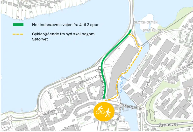Cyklister og gående fra nord mod syd kan fortsat benytte cykelstien og fortovet på Christian 8.s Vej. Kommer du fra syd skal du bruge fællesstien bagom Søtorvet frem til foråret 2026, hvor vi forventer, at du igen kan bruge Christian 8.s Vej.