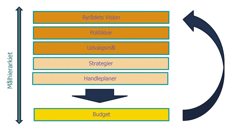Budgettet indeholder den overordnede politiske prioritering af ressourcer indenfor kommunen. Denne prioritering bør afspejle niveauerne i styringsrammen fra de overordnede politiske målsætninger til udmøntningen heraf i strategier og handleplaner. Derudover sætter budgettets størrelse den økonomiske ramme for hvilke mål, der kan realiseres. Derfor bør rammerne for kommunens økonomi indgå i fastsættelsen af politiske målsætninger.