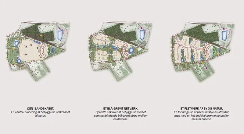 - Et blå-grønt netværk: Spredte enklaver af bebyggelse sammenbundet af et naturnetværk oplagt til varierende boformer.