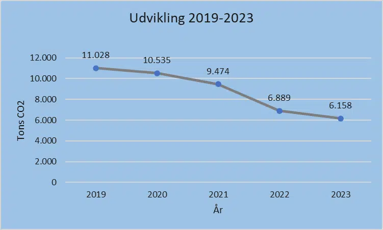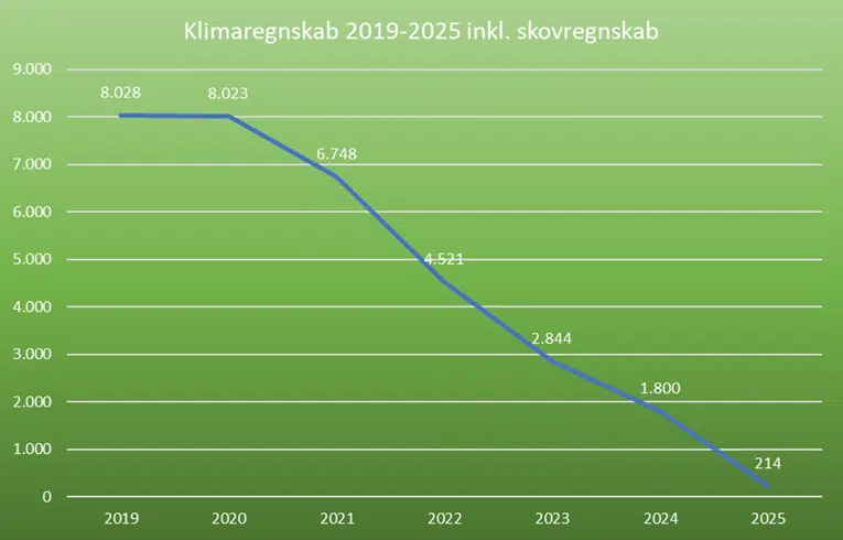 Et andet område med stort fald er vejbelysningen, der også har gavn af den positive udvikling af elproduktionen i Danmark. Og så er der også i år kommet mere skov og flere elbiler i regnskabet. Buskørsel derimod trækker den anden vej.
