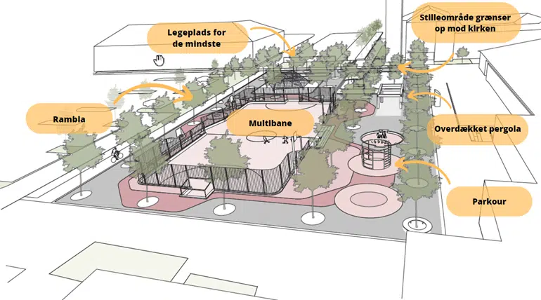 Her bliver plads til et stille hjørne, hvis du vil slappe af, samtidig med, at der bliver plads til liv og høj aktivitet – fx streetbasket, yoga, kunstudstillinger m.m.